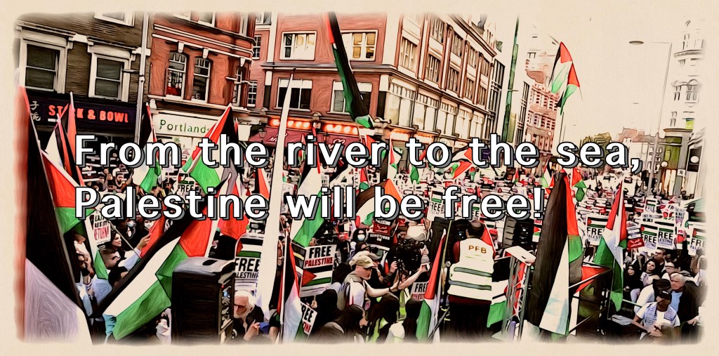 A similar misinterpretation is happening with the slogan: “From the river to the sea, Palestine will be free”. It implies an equivalence between an assertion of Palestine’s right to a existence and a denial of Israel right. It may be true that Hamas want to wipe Israel off the map, and the illegal settlements cannot claim any such right, but it’s the avowed intention of right wing Israeli politicians to obliterate Gaza – and western politicians condone it!