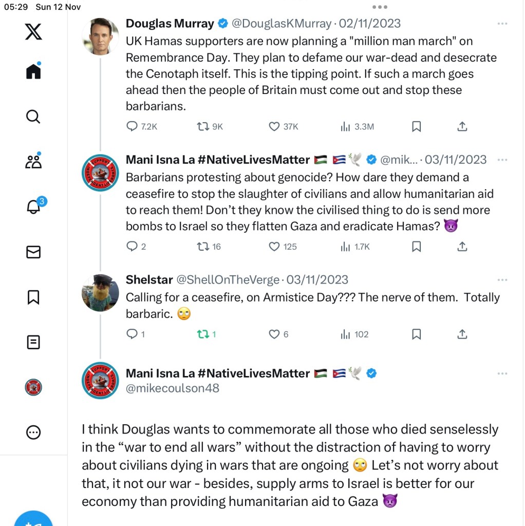 There was some disturbance at the Cenotaph, provoked rather than predicted by Braverman, but it’s not easy to disentangle all the conflicting accounts. It appears that the Two Minutes Silence was observed uninterrupted, thanks largely to the Met Police preventing the mob from getting close “to pay their respects”, but it flared up afterwards. Who started it depends on who you believe, on this occasion I choose to believe the police and reserve my criticism for later.