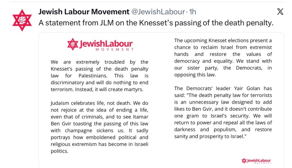 A petition has been started on the government website which already has >15k signatures: Urge Israeli Government to stop law allowing execution of Palestinian prisoners https://petition.parliament.uk/petitions/754432 I’ve signed it but won’t be promoting it as I think it’s a waste of time – the law has already been passed, Ben Gvir is getting drunk on champagne to celebrate, and Starmer is too weak to remonstrate even mildly 😠 I’ve included link to the petition so you can sign if you wish.